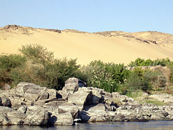 Steiniges Ufer am Nil, dahinter ein Grünstreifen und Sanddünen. Oberägypten.