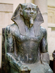 Abb. links: Sitzstatue von Pharao Chephren. Ägyptisches Museum Kairo. (Foto: Jon Bodsworth)