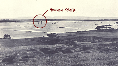 Abb. oben: die Nil-Überschwemmung wie sie vor dem Bau des Assuan-Staudammes vonstatten ging und somit sich auch in der pharaonischen Zeit alljährlich ereignet hatte. Hier im Bereich von Theben (Luxor), westlich des Nils. Gut zu erkennen sind die sogenannten Memnon-Kolosse, die beiden großen Statuen, die einst den gigantischen Totentempel von Pharao Amenophis III. bewachten. Dieser Tempel wurde selbst in der Pharaonenzeit teilweise überschwemmt ein Vorgang der mythologischen Charakter hatte, nämlich das Auftauchen des sog. "Urhügels" aus den Fluten des Nun (Urozean) während des Weltschöpfungsaktes. Einst symbolisierte auch der Totentempel diesen Urhügel. (Bildquelle: "Die Welt am Nil" von Adolf Erman, 1937)