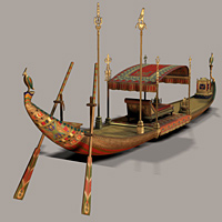 Abb. oben: Königliches Schiff aus Holz. Prunkvoll verziert und in der klassischen gebogenen Form. Zwei Standarten in der Mitte demonstrieren das Königstum. (Digitales Modell, Rekonstruktion: Elke Bassler)