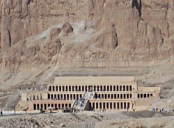 Abb. links: der brühmte Totentempel der Pharonin Hatschepsut. Dieser Tempel ist die bedeutendste erhalten gebliebene Kultstätte Hatschepsuts, neben der sog. "Roten Kapelle" und eben diesem Tempel verdankt die Forschung die Entdeckung dieser einzigartigen Königin eine Königin, die traditionelle Rahmen überschritt und sich selbst zum Pharao erhob.