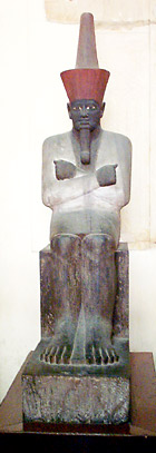 Abb. links: Sitzstatue von Pharao Mentuhotep II., 11. Dynastie. Kairo, Ägyptisches Museum. (Foto: Peter Funk)