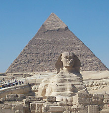 Abb. links: Eine der Pyramiden von Gizeh, die sog. Chefren-Pyramide, und im Vordergrund die große Sphinx.. Die "perfekte" Pyramidenform gelang erst nach mehreren Anläufen. Auf dem oberen Teil der Chefren-Pyramide ist noch gut die Ummantelung aus hellem Kalkstein zu erkennen, die einst die ganze Pyramide umgab.