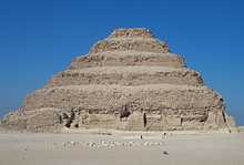 3. Dynastie. Erster monumentaler Steinbau in Ägypten. Bau war ursprünglich begonnen als einfache Mastaba, die dreimal vergrößert und zweimal überbaut wurde, mit zunächst vier Stufen danach mit sechs Stufen. (Foto: Peter Funk)