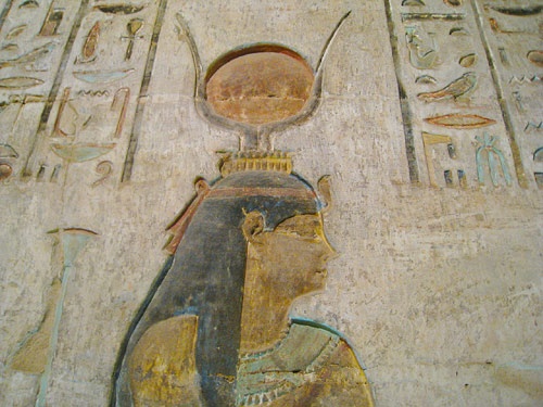 Abb. oben: Schöne Wandmalerei der Göttin Hathor als Motiv, im Tempel der Hathor.
