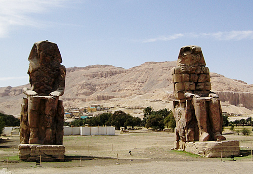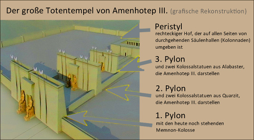 Es war wohl der größte jemals in Ägypten gebaute Tempelkomplex! Ägyptologen berechneten, dass der Tempel einst sogar größer gewesen sein soll, als der Karnak-Tempel. Leider ist der Tempel infolge wiederholter Plünderungen und Erdbebenschäden weitgehend von der Bildfläche verschwunden. Nur noch die beiden berühmten Memnon-Kolosse (Abbildung weiter oben) stehen an ihrem alten Ort. Sie waren ursprünglich »Herrscher der Herrscher« genannt worden.