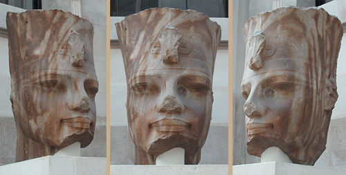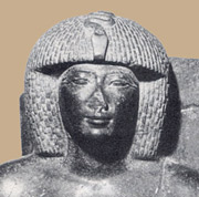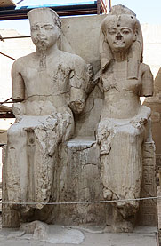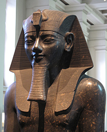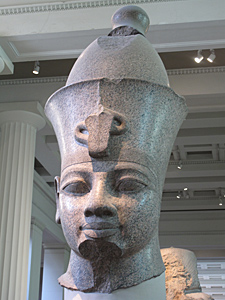 Abb. links: Oberteil einer überlebensgroßen Sitzstatue von Amenhotep III. (=Amenophis III.),