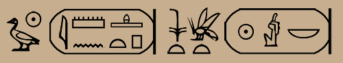 Abb. oben: der Eigenname (links) und der Thronname (rechts) in Kartuschen geschrieben, von Amenhotep III. Sein Eigenname: Amenhotep (= Amun ist zufrieden) und sein Thronname: Neb-maat-re (= Herr der Göttin Maat ist Re).