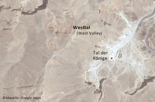 Abb. oben: Das Tal der Könige und das Westtal, wo Amenhotep III. bestattet wurde. Das Grab heißt heute WV22 (= West Valley Nr. 22)