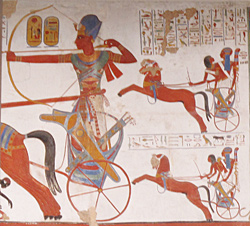 Abb. links: Ramses auf einem Streitwagen. Rekonstruierte Malerei im British Museum, London. (Foto: Anja Semling)