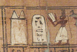 Abb. links: Ausschnitt aus einem Totenpapyri. In der Jenseitsliteratur vielfach illustriert und beschriftet, geht es oft religiöse Themen und Jenseits-Vorstellungen. Auch hier spielen die Priester eine wichtige Rolle. Sie rezitieren, helfen dem Verstorbenen durch Anbetungen an die Götter oder sind anderweitig beschäftigt. Hier steht ein Priester vor einem Grab, und liest Rezitationen vor.