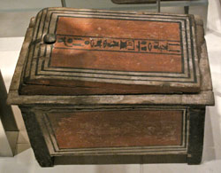 Abb. oben links: Schemel aus Holz; Oben rechts: dekorierte Truhe aus Holz.