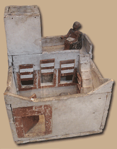 Abb. links: Nachbildung aus dem Alten Ägypten eines Wohnhauses mit Schiebetüren, auf der Dachveranda sitzt der Hausherr. Holz-Modell aus einem Grab, sogenanntes "Seelenhäuschen".