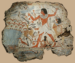 Abb. oben links: der Adlige Nebamun beim Jagen im Dickicht mit Wurfholz. Ausschnitt Grabmalerei.