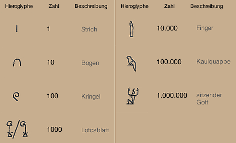 Die Ägypter verwendeten ein Dezimalsystem mit Zehnern und Hundertern. Die wichtigsten Zahlen hatten spezielle Zeichen. Die anderen Zahlen wurden als Vielfaches dieser Ziffern geschrieben. Entweder wiederholte man das Zeichen in der erforderlichen Anzahl oder schrieb einige Striche neben das Symbol. Die tatsächliche Zahl war die Summe aller wiederholten Zeichen.