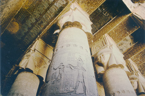 Die obige Abbildung zeigt nebst den wuchtigen Hathor-Säulen auch reliefierte Details an der Decke, die Barken der Sterngötter, die im himmlischen Gewässer fahren, zeigen. In einer Reihe auch die Dekane.