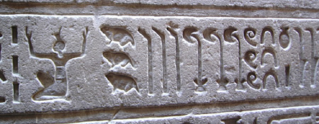 Abbildung unten: Zahlen in Hieroglyphen, (Edfu-Tempel). Ganz links: Das Zeichen "sitzender Gott" steht für Million bzw. die Umschreibung für eine unvorstellbar große Zahl. Weitere Zahlen-Schriftzeichen die abgebildet sind: Hundertausender, Zehntausender, Tausender, Hunderter, Zehner. Die ganze Zahl lautet 1.333.330. (Foto: Carmen Wolfram)