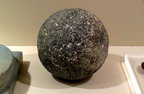 Abb. oben: Steinkugel aus Dolerit, ca. 16 cm Durchmesser. Aus diesem sehr harten Stein machten die Ägypter Werkzeuge. Mit Dolerit war es z.B. möglich Granit zu brechen. Diese sogenannten Doleritkugeln, wurden auch beim Bau der Pyramiden eingesetzt.