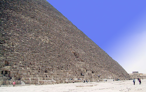 Eine der gigantischen Seiten der Cheops-Pyramide unzählige Steinlagen auf denen einst eine aus Kalktein bestehende Ummantelung lag.