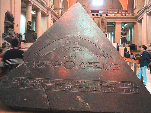 Dieses Pyramidion, Abschlußstein einer Pyramide, gehört zur Pyramide des Amenemhet III. in Dahschur. Die Inschrift enthält u.a. des Königs Thronname (Maat-en-Re) und Eigenname (Amen-em-het).