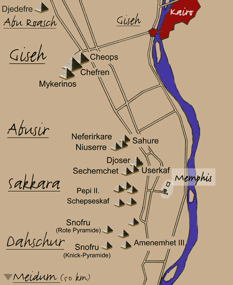 Unas, Teti, Userkaf, Djoser, Unas, Sechemchet, Merenre, Pepi I., Djedkare, Pepi II., Ibi, Schepseskaf, Chendjer