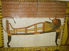 Sennedjem, TT1 Die Mumie des Sennedjem liegt auf der Totenbahre. (Foto: Elvira Kronlob)