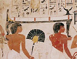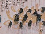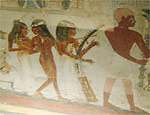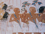 Abb. oben: Träger von Grabbeigaben. Zahlreiche Möbelstücke, wie Bett, Stuhl, Gefäße mit kostbaren Inhalten und Truhen werden dem verstorbenen und für's Jenseits zurecht gemachten Ramose mit in sein Grab gegeben, damit er der dort in seinem weiteren jenseitigen Leben genauso gut ausgestattet sein möge, wie zuvor im Diesseits. (Foto: Elke Bassler)