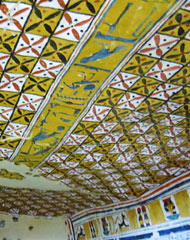 Abbildung oben: die herrlich dekorierte Decke in der Grabkammer des Sennefer; das Muster stellt dekorative Stoffe dar. Eine der mitbestimmenden Farben ist hier Gelb, eine Farbe die dem irdischen Bereich zugeordnet wird, im Gegensatz zur Finsternis (als Frabe: kek), und mit dem Sonnenlicht (als Farbe: hedj) in Verbindung gebracht wird, aber auch mit dem kostbaren Material Gold. (Foto: Elvira Kronlob)