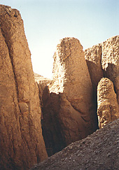 Abb. links: hohe Felsen, Blick auf zerklüftete Gebirgslandschaft im Tal der Könige mit einem noch nicht erforschten Gräberfeld. (Foto: Uwe Wassenberg)