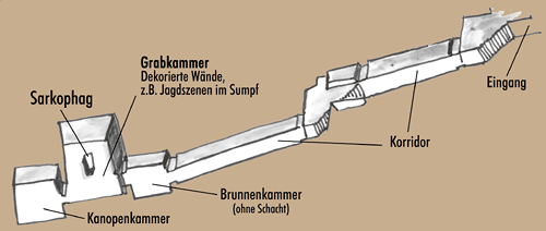 Ein unterirdischer Korridor mit Treppe führt zur Grabkammer, der eine Brunnenkammer ohne Schacht vorgelegt ist und eine Kanopenkammer befindet sich auf der gegenüberliegenden Seite der Grabkammer. Dekoriert ist diese Kammer mit herrlichen Szenen einer Jagd auf Vögel und Nilpferde im Papyrussumpf die einzigen solcher Darstellungen in einem Königsgrab. Über der Tür zur Kanopenkammer sind die vier Horussöhne abgebildet. Pfeiler oder Säulen gibt es keine im Grab.