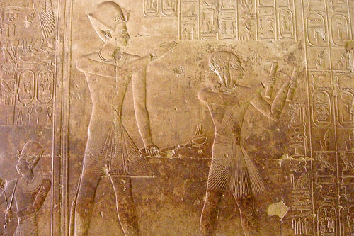 Abb. unten: Sethos I. mit seinem Sohn Ramses II. (sein Thronnachfolger) auf der Königsliste von Abydos. Die beiden bringen ein Opfer dar und der junge Ramses rezitiert aus einer Papyrusrolle das Ritual der Lobpreisungen für die vergangenen Könige. (Fotos: Elke Bassler)