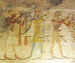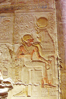 Abb. oben: Sethos I. vor der Göttin Isis. Sie hält ihm das Symbol für Leben an die Nase. Isis trägt das königliche Abzeichen, die Geierhaube. Die Geierhaube war ursprünglich der Kopfschmuck der oberägyptischen Göttin Nechbet (oben in Bild, teils zerstört).