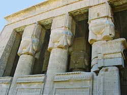 Im Tempel von Dendera, der auch "Sistrum-Tempel" genannt wird, wurde Hathor als Göttin des Kosmos verehrt. Die Tempelfassade (Abbildung unten) besitzt sechs hathorische Säulen, die Musikinstrumente der Göttin darstellen und jeweils von Hathors Haupt gekrönt werden.