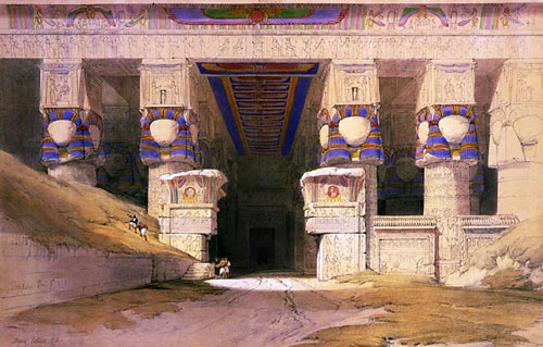 Abb. oben: Frontalansicht des Tempels von Dendera, um 1839, Zeichnung von David Roberts. Gut zu erkennen sind die hathorischen Säulen, jede mit einem Hathor-Kapitell über dem Haupt. Damals als der Künstler D. Roberts dies Bild schuf, waren noch mehr Farbflächen am Hathortempel sichtbar als heutzutage. Ägyptische Tempel waren immer mit prächtigen Naturfarben bemalt.