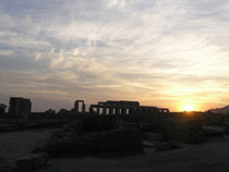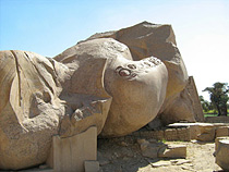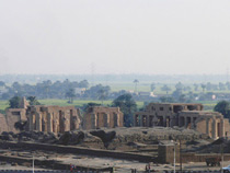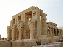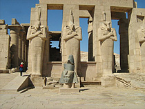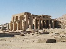 Dieser weitläufige Tempel ließ Ramses II. zwischen der Wüste und dem (heutigen) Dorf Qurna erbauen. Leider zeugen heute nur noch wenige Ruinen von der Grandiosität des Bauwerkes.