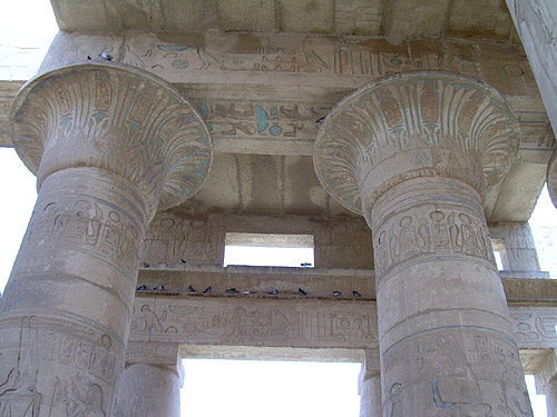 - Zweiter Hof mit Osiris-Pfeilern und einer Vorhalle (vor dahinterliegender Säulenhalle)