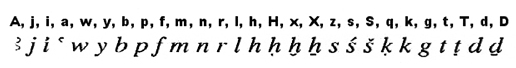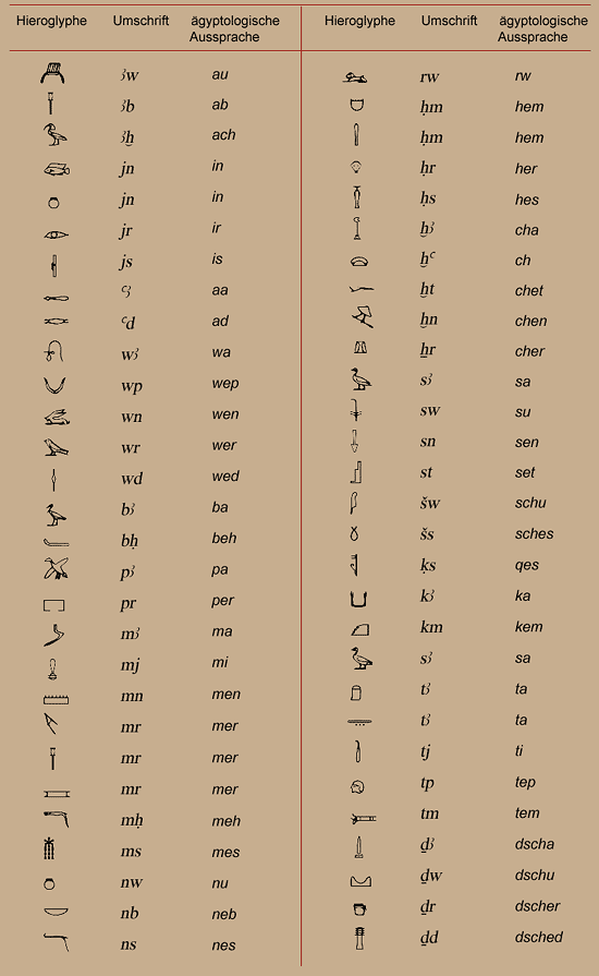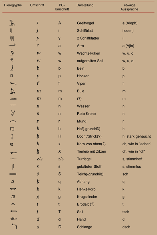 Die alten Ägypter verwendeten unter anderem eine Art Alphabet mit etlichen "Buchstaben", die je für ein Konsonanten standen diese Alphabet-Zeichen wurden von der Wissenschaft zusammengefaßt; ursprünglich von R. Lepsius und A. Erman. Diese Alphabet-Zeichen finden sich in untenstehender Tabelle gelistet.