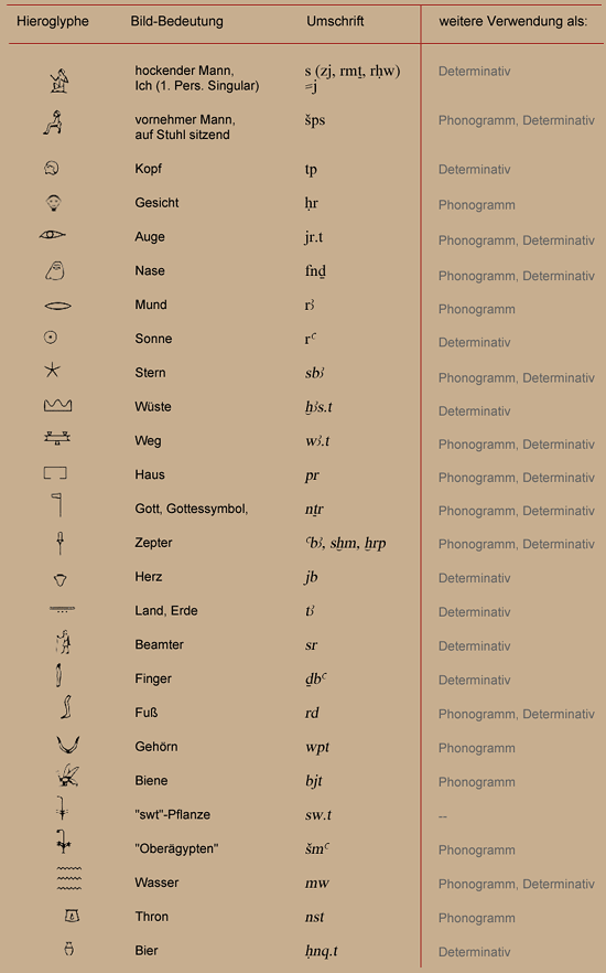 Deutzeichen (Determinative): diese bleiben stumm. Sie werden als echte Symbolzeichen angegeben, zu welcher Vorstellungsgruppe ein Wort gehört. Damit mindern sie die Vieldeutigkeit einer vokallosen Schrift und ersetzen am Wortende stehend, die im Ägyptischen fehlenden Worttrenner weitgehendst.