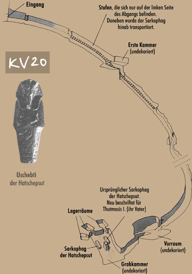 Das Grab der Hatschepsut im Tal der Könige, liegt auf der Westseite des Nils, ist halb verschüttet und die Mumie wurde dort auch nie gefunden, sondern im Grab »KV 60«, im Jahre 1903 von H. Carter entdeckt; in jenem Grab von Hatschepsuts Amme Sit-Ra. Jedoch erst Jahrzehnte später wurde die Mumie als die der sagenhaften Hatschepsut identifiziert. (KV = King's Valley)