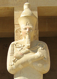 Abb. rechts: osirianisches Bildnis der Hatschepsut, sie ist eingegangen ins Totenreich. Pfeiler ihres Totentempels Deir el-Bahari. (Foto: Elvira Kronlob)