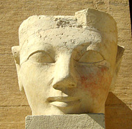 Abb. rechts: Kopf einer Statue Hatschepsuts, Deir el-Bahari. (Foto: Elvira Kronlob)