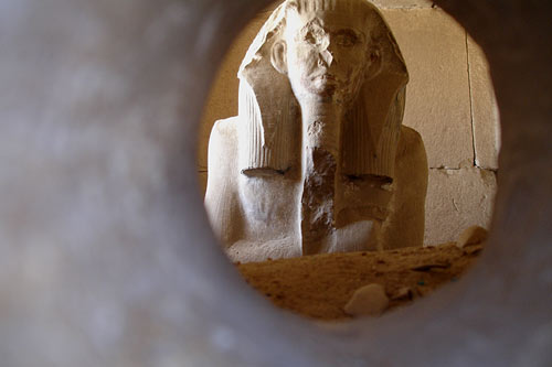 Abb. oben: Sitzstatue Djosers. Im Djoser-Pyramidenbezirk im sog. Serdab steht diese Ka-Statue heute ein Replik, das Original befindet sich im Ägyptischen Museum Kairo. Die Statue, die magisch belebt war und der "Ka" seine innewohnende Kraft war, richtete seinen Blick durch die Sehschlitze im Serdab Richtung Norden zu den Zirkumpolarsternen; dort wo sich der König zu seinen Brüdern gesellte.