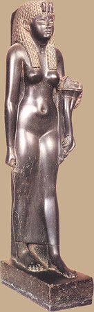 Abb. links: Abbild von Kleoptara auf Thronsitz, mit Geierhaube, Zepter, Kuhgehörn und Sonnenscheibe (Attribute königlicher Macht)