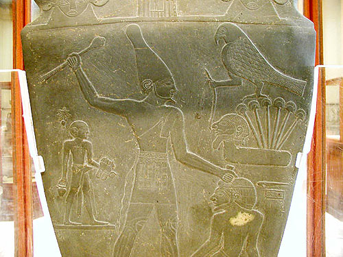 Die berühmte Palette des Narmer (Abb. unten) feiert den Sieg dieses Fürsten über Unterägypten um das Jahr 3000 v. Chr. In einer alten Inschrift liest man über den König Narmer folgendes: »Er ist ein Köpfezertrümmerer