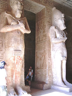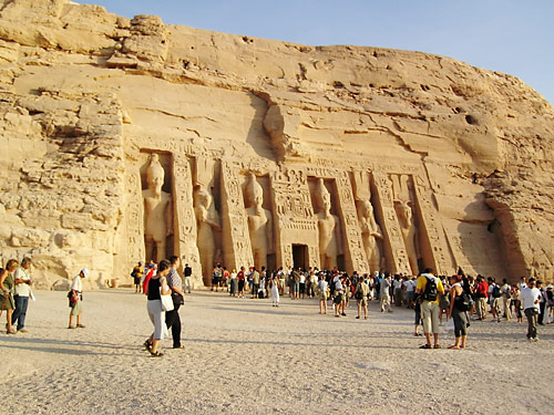 Dieser Felsentempel bei Abu Simbel wurde zur Zeit des Ramses des Großen vollständig in den anstehenden Fels getrieben, auf einer Breite von 38 Metern und einer Tiefe von 65 Metern ein Höhepunkt ramessidischer Bauten in Nubien. Nach überliefertem Schema ist auch vor diesem Tempel ein Vorplatz (wie oft üblich bei ägyptischen Tempeln), den man einst durch zwei Pylone von Norden nach Süden her betreten konnte. Die ungewöhnliche Fassade des Tempels zeigt vier kolossale Statuen, die den Pharao darstellen, auf dem Thron sitzend, 20 Meter hoch; sie sind die quasi die Stützpfeiler der 31 Meter hohen Fassade und symbolisieren insbesondere die Macht Ramses' II.