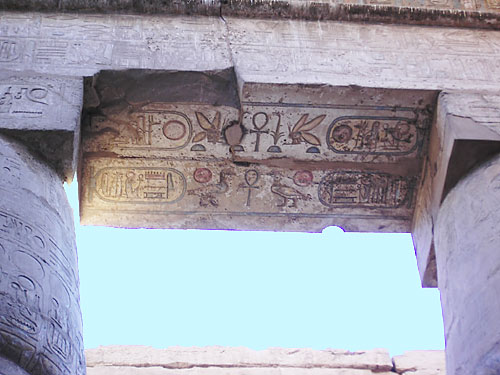 Abb. oben: Bestandteile der Königstitulatur Ramses' II.: (ganz oben) sein Thronname "User-maat-re Setep-en-re" und sein Eigenname "Ramses meri Amun". Karnak-Tempel.