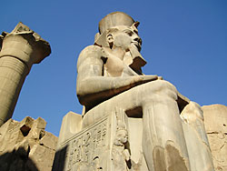 Abb. oben: kolossale Sitzstatue Ramses' des Großen in Luxor. (Foto: Carmen Wolfram)