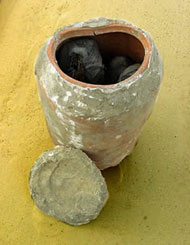 Abb. links: Gefäß mit Tierbündeln darin, davor der Deckel. (Foto: Tuna e.V.)