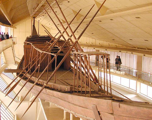 Ein echtes Sonnenschiff wurde 1954 südlich der Cheopspyramide entdeckt und wurde zu jener Zeit in der 4. Dynastie, dem Pharao mit in seinen riesigen Grabkomplex gegeben. Die Barke ist aus Zedernholz, Sykomore und Jujube, sie ist ca. 43 Meter lang und in der Mitte etwa 6 Meter breit. Ausgestattet ist das Schiff auch mit mehreren Ruderpaaren.