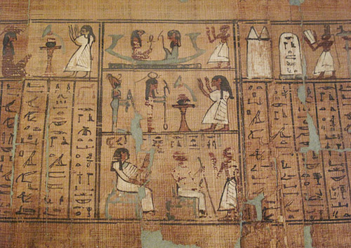 Abb. oben, mittig, unten: Ausschnitt aus einem Totenpapyrus. Neues Reich